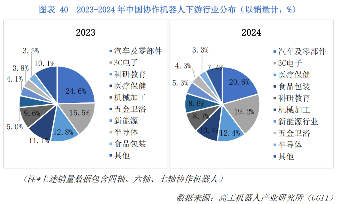 在技術(shù)迭代與場景落地的雙重共振下,中國協(xié)作機器人市場持續(xù)擴容。GGII數(shù)據(jù)顯示,2024年中國協(xié)作機器人在汽車及零部件、3C電子、食品包裝、機械加工等工業(yè)細分領(lǐng)域合計占比約59%。反映出制造業(yè)智能化轉(zhuǎn)型對柔性協(xié)作裝備的剛性需求。
