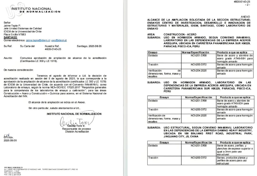 為突破這一技術壁壘,大明重工自2022年起組建專項團隊,引入智利認可的檢測設備與標準化流程,經歷多次技術談判,于近日通過了審核測試,成功縮短測試周期,并實現測試報告在智利官方系統的直接備案,成為中國首家也是目前唯一可以直接進行智利NCH203材料測試的分支實驗室,將為國內企業大幅降低時間與經濟成本。