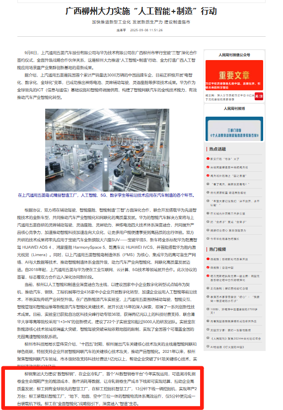 9月9日,《人民日?qǐng)?bào)》經(jīng)濟(jì)版刊發(fā)《廣西柳州加快發(fā)展新質(zhì)生產(chǎn)力 推動(dòng)企業(yè)從“制造”轉(zhuǎn)向“智造”》報(bào)道。文章指出,柳州以人工智能和制造業(yè)深度融合為主線,以建設(shè)國家中小企業(yè)數(shù)字化轉(zhuǎn)型試點(diǎn)城市為契機(jī),推動(dòng)企業(yè)開展數(shù)字化轉(zhuǎn)型,其中,柳工挖掘機(jī)智慧工廠,13分鐘下線一輛挖掘機(jī),實(shí)現(xiàn)年產(chǎn)2萬臺(tái)。