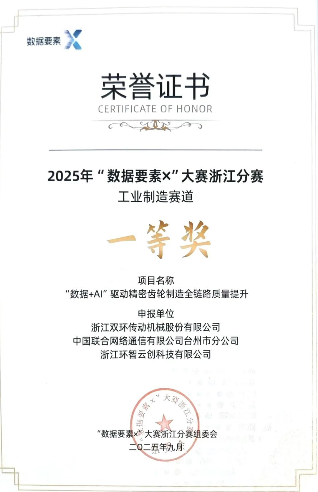 近日,在2025年“數據要素×”大賽浙江分賽決賽上,由雙環傳動及子公司環智云創聯合中國聯合網絡通信有限公司臺州市分公司研發的《“數據+AI”驅動精密齒輪制造全鏈路質量提升》項目,從全省168個入圍項目中脫穎而出,榮獲工業制造賽道一等獎!這是對雙環及環智云創技術實力的高度認可,彰顯了公司在推動制造業數字化轉型進程中的標桿地位。