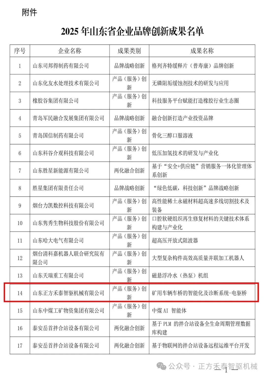 2025年9月26日,山東省質(zhì)量評(píng)價(jià)協(xié)會(huì)發(fā)布2025年山東省企業(yè)品牌創(chuàng)新成果名單,山東正方禾泰智驅(qū)機(jī)械有限公司《礦業(yè)車輛車橋智能化及診斷系統(tǒng)-電驅(qū)橋》項(xiàng)目入選“產(chǎn)品服務(wù)創(chuàng)新成果品牌”。