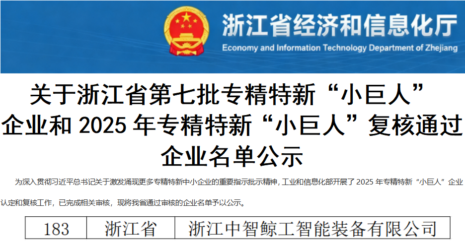 浙江省工業和信息化廳正式公示第七批專精特新 “小巨人” 企業名單,我司憑借在細分領域的深耕積淀、強勁的創新實力與卓越的市場表現,成功躋身榜單!