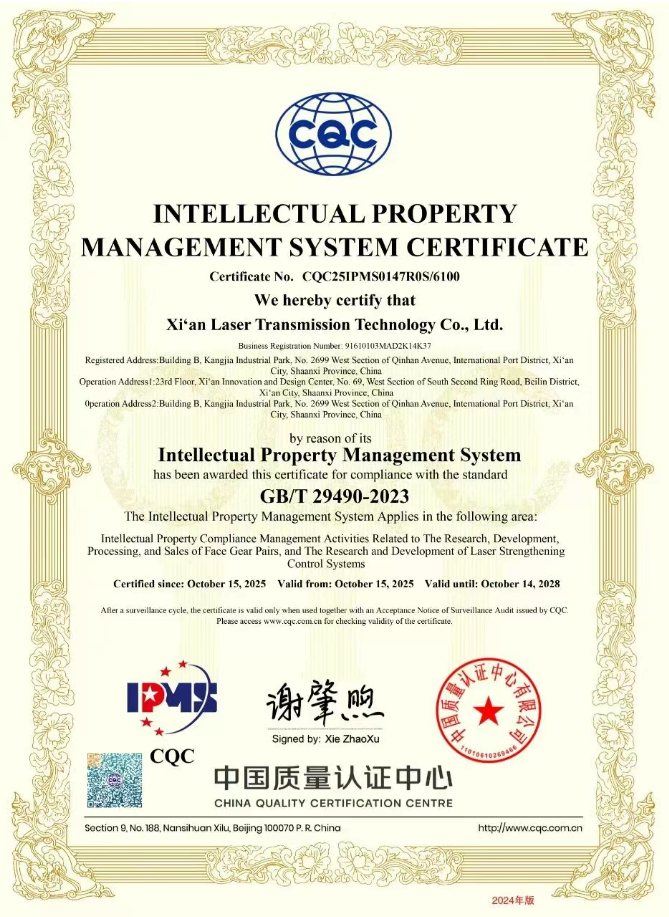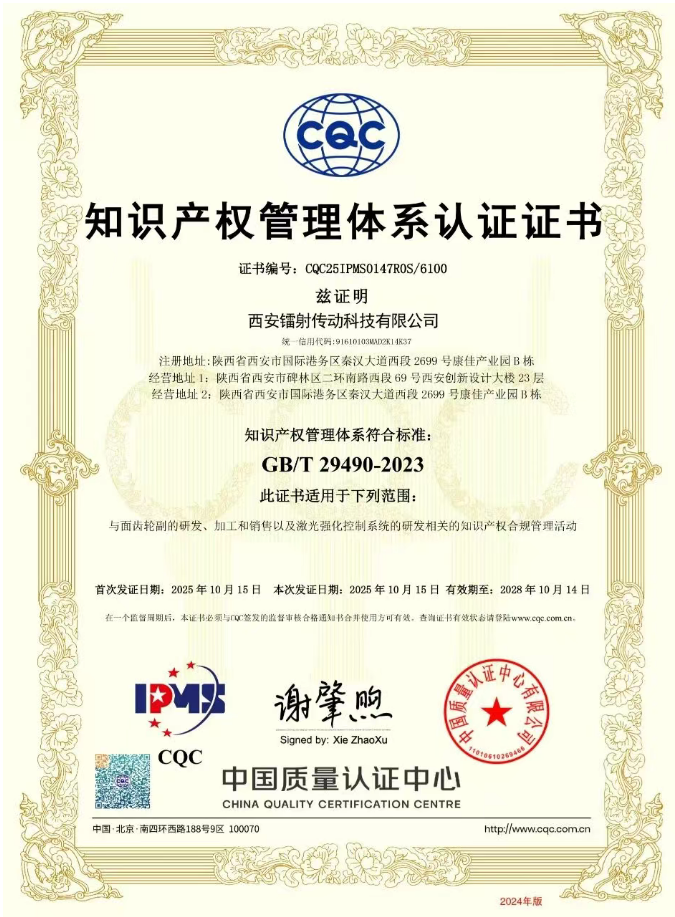 近日,西安鐳射傳動科技有限公司(以下簡稱“鐳射傳動”)正式通過國家權(quán)威機構(gòu)——中國質(zhì)量認證中心的嚴格審核,榮獲 《知識產(chǎn)權(quán)管理體系認證證書》證書編號CQC25IPMS0147R0S/6100,標志著公司在知識產(chǎn)權(quán)規(guī)范化、系統(tǒng)化管理方面邁上新臺階!