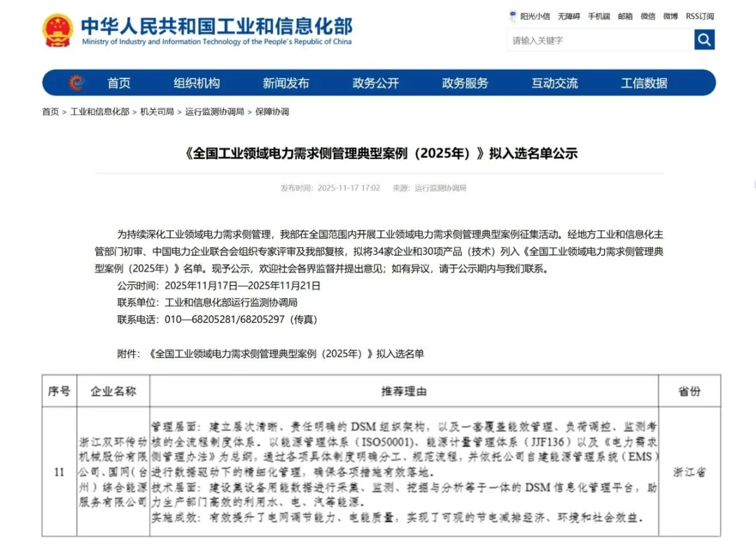 近日,由雙環(huán)傳動與國網(wǎng)(臺州)綜合能源服務(wù)有限公司聯(lián)合申報的電力需求側(cè)管理(DSM)實踐案例,經(jīng)國家相關(guān)部門嚴(yán)格評審,成功入選“全國工業(yè)領(lǐng)域電力需求側(cè)管理典型案例(2025年)”。此次榮譽是對雙環(huán)傳動持續(xù)推進能源管理現(xiàn)代化、踐行可持續(xù)發(fā)展理念的充分肯定,標(biāo)志著公司在綠色低碳發(fā)展與能源精細化管理方面獲得了國家級權(quán)威認(rèn)可,走在了全國前列。