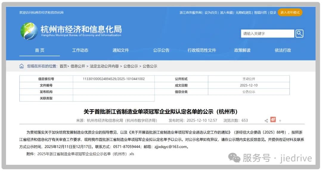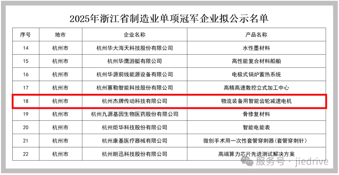 2025年12月11日,浙江省經(jīng)濟(jì)和信息化廳公布首批“浙江省制造業(yè)單項(xiàng)冠軍企業(yè)”認(rèn)定名單,杭州杰牌傳動(dòng)科技有限公司通過(guò)首批“浙江省制造業(yè)單項(xiàng)冠軍企業(yè)”認(rèn)定。