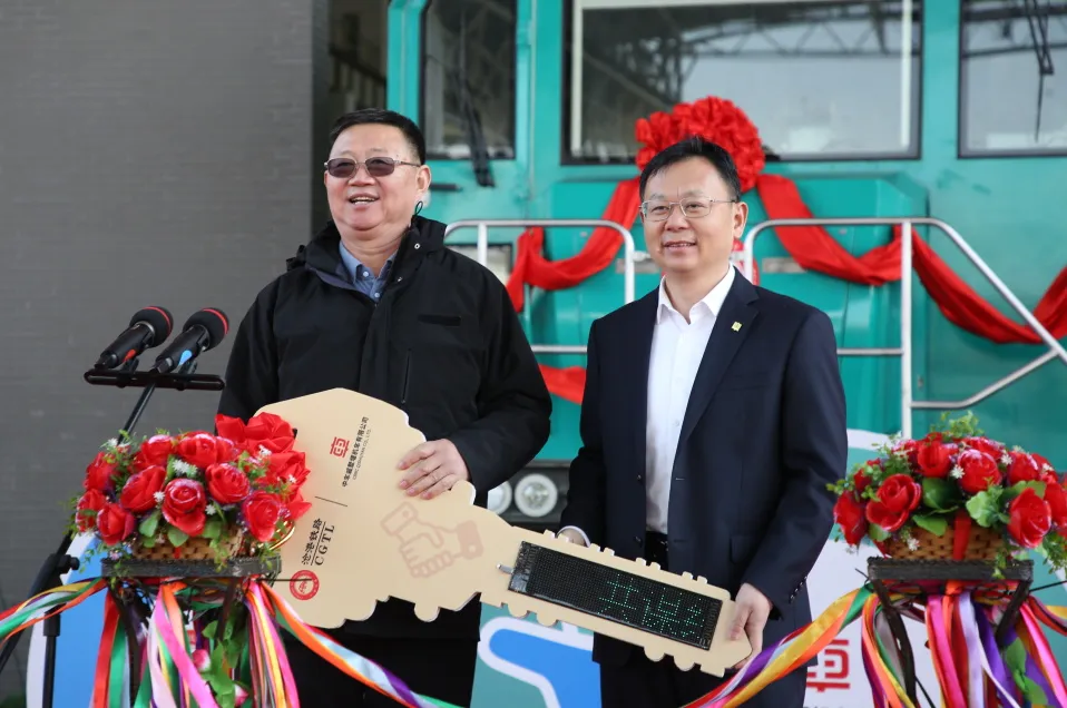 交付儀式現場,中車戚墅堰公司總經理唐永明向滄港鐵路公司常務副經理于瑞強遞交了象征機車交付的“鑰匙”。