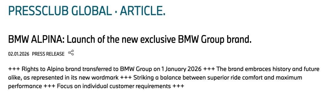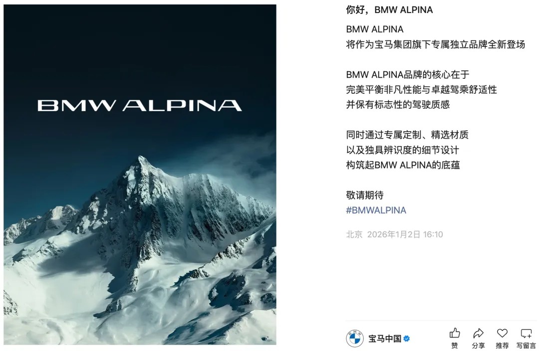據了解,寶馬集團于1月1日官宣,ALPINA商標權正式移交寶馬集團,這一擁有近60年歷史的高性能汽車品牌,自此以“BMW ALPINA”的身份成為寶馬集團旗下專屬獨立品牌。此次商標權移交標志著寶馬集團對ALPINA的收購正式完成,也意味著這個深耕寶馬車型改裝與定制的品牌,將在寶馬體系下開啟全新發展階段。