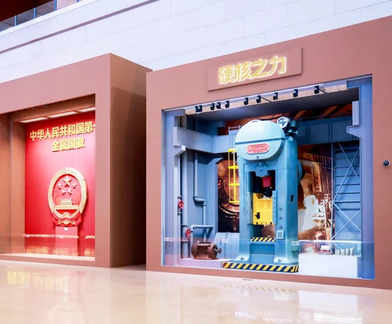 在展區藝術長廊核心位置,我國第一枚金屬國徽旁,陳列著濟南二機床研制的我國第一臺大型閉式機械壓力機,該設備研制于1955年,填補了當時國內在該類重大技術裝備領域的空白。在“智能制造”專區,展示了濟南二機床自主研制的大型高效智能伺服沖壓生產線,該產線集成了伺服驅動、智能控制等關鍵技術,是支撐汽車行業高質量發展的關鍵核心裝備。從國內首臺“從0到1”的突破,到高效智能產線的自主可控,充分體現了中國裝備制造的蝶變之路。