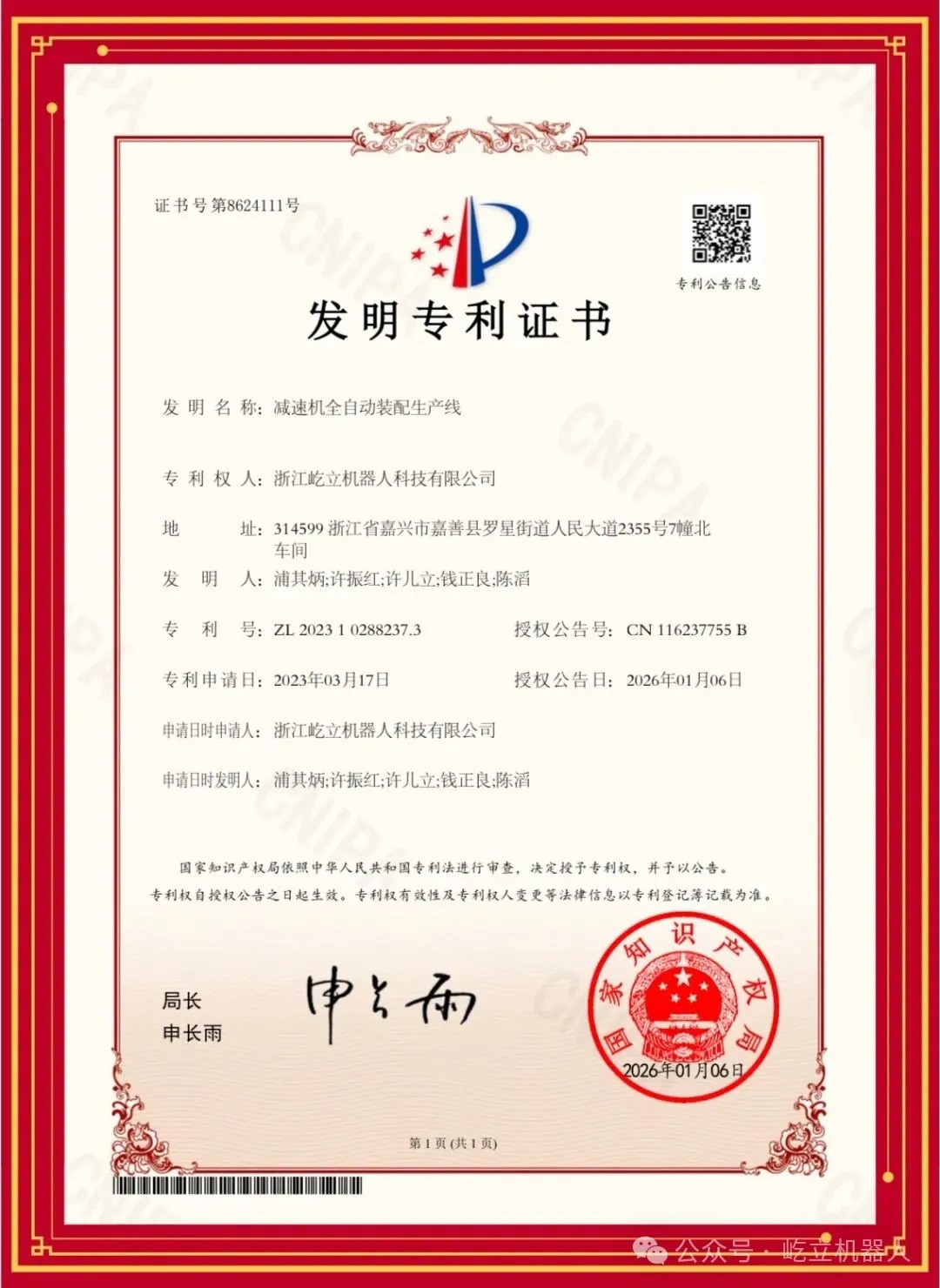 近日,屹立機(jī)器人迎來了振奮人心的喜訊——由浙江屹立機(jī)器人科技有限公司自主研發(fā)的減速機(jī)全自動(dòng)裝配生產(chǎn)線技術(shù),正式獲得國(guó)家發(fā)明專利授權(quán)(專利號(hào):ZL 2023 1 0288237.3),這是公司在自動(dòng)化解決方案領(lǐng)域深耕創(chuàng)新的又一重要成果!
