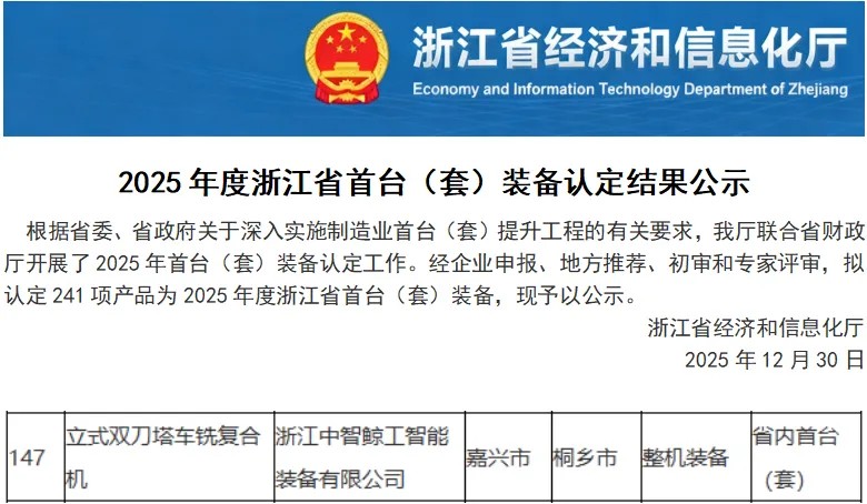 近日,2025 年度浙江省首臺(tái)(套)裝備認(rèn)定結(jié)果正式公示,由浙江中智鯨工智能裝備有限公司自主研發(fā)的立式雙刀塔車銑復(fù)合機(jī)成功入選,獲評(píng)省內(nèi)首臺(tái)(套)整機(jī)裝備!