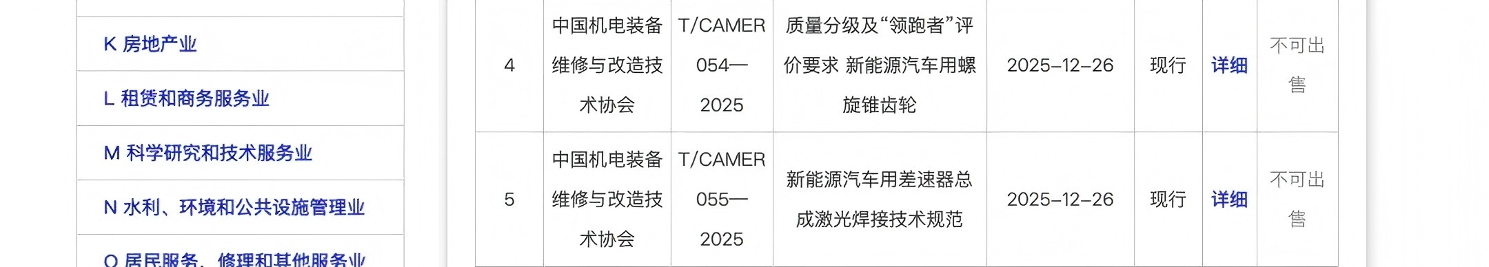 2025年12月26日,由機械傳動分會組織制定的《質量分級及“領跑者”評價要求新能源汽車用螺旋錐齒輪》T/CAMER 054-2025和《新能源汽車用差速器總成激光焊接技術規范》T/CAMER 055-2025兩項團體標準正式發布實施。這標志著機械傳動分會在新能源汽車核心零部件領域的團體標準建設工作取得重要階段性成果,將為行業質量管控、技術升級及規范化發展提供關鍵依據。