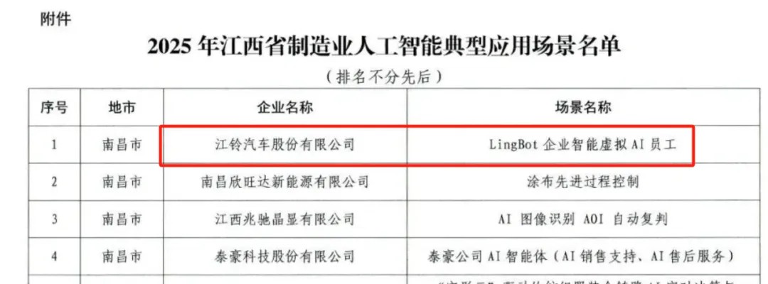 近日,江西省工業(yè)和信息化廳正式公布《2025年制造業(yè)人工智能典型應(yīng)用場(chǎng)景名單》。江鈴汽車股份有限公司的“LingBot企業(yè)智能虛擬AI員工”場(chǎng)景成功入選,標(biāo)志著江鈴在推動(dòng)人工智能與先進(jìn)制造業(yè)深度融合方面取得新突破。