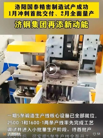 2026年開年即沖刺!濟源鋼鐵集團旗下洛陽國泰精密制造有限公司(以下簡稱“國泰精密制造”)傳來“開門紅”捷報:一期5條鍛造生產線核心設備已全部就位,2500-1和1600-1兩條產線率先完成工藝調試并進入小批量生產階段,已成功產出鍛件6000余件,待首批產品交付后將全面轉入大批量生產;其余3條產線正按計劃推進熱試,2026年1月底將全部完成工藝調試,2月即可實現5條生產線全面開工。
