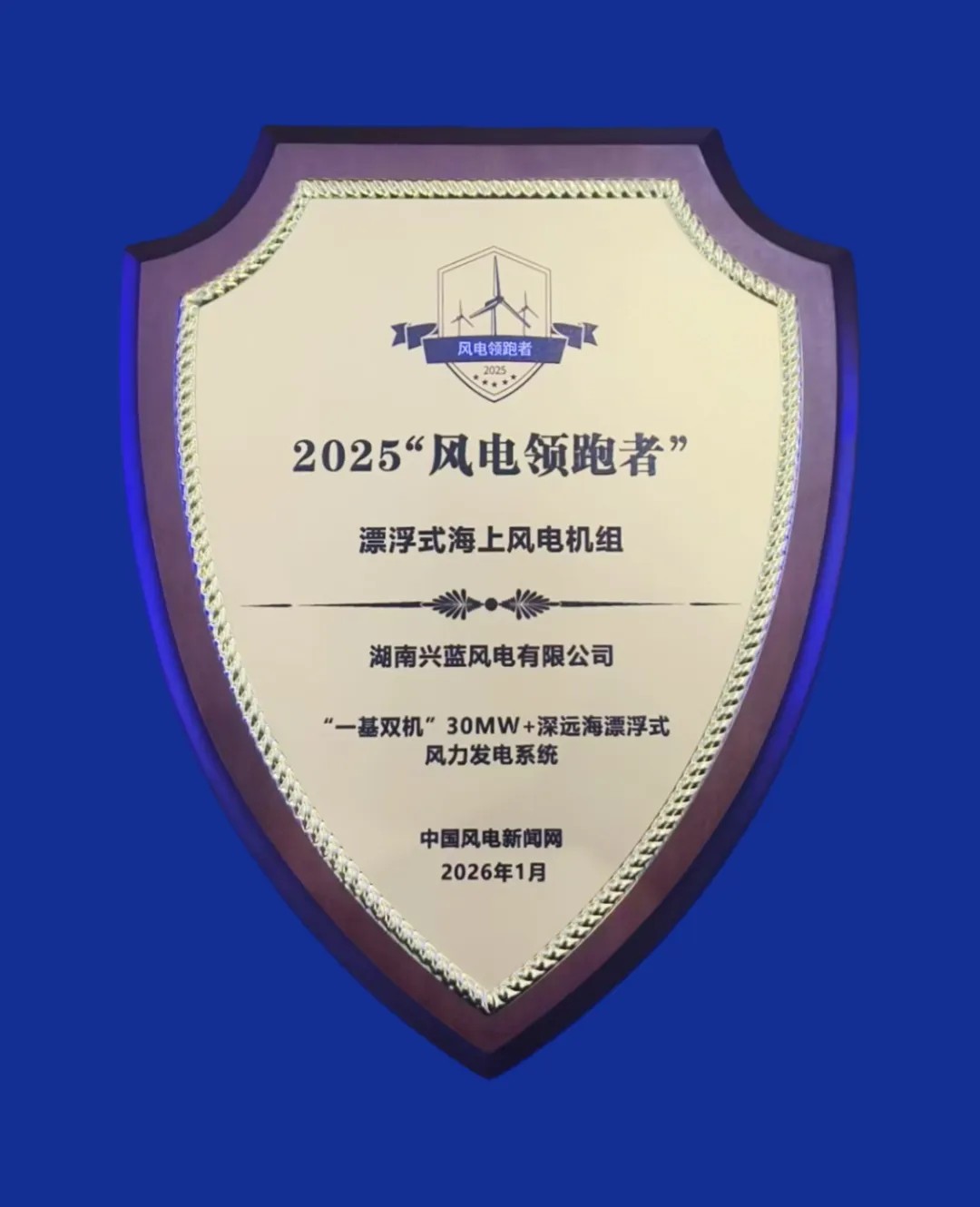 2026年1月8日,在第五屆“風(fēng)電領(lǐng)跑者”技術(shù)創(chuàng)新論壇暨頒獎盛典上,公司“一基雙機(jī)”30MW+深遠(yuǎn)海浮式風(fēng)力發(fā)電機(jī)組系統(tǒng)獲評“最佳海上機(jī)組”獎項。