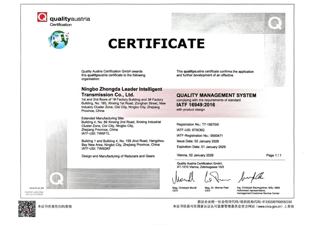 近日,寧波中大力德智能傳動股份有限公司成功通過IATF16949:2016質量管理體系認證,并獲得認證證書。