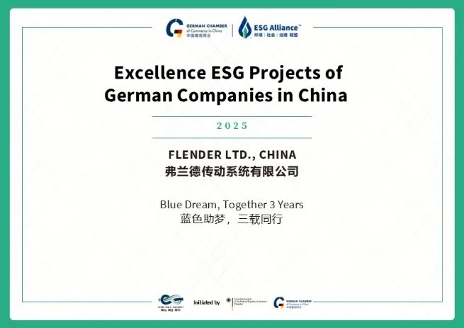 2025年,弗蘭德傳動系統有限公司憑借“零和博弈轉向生態共贏”與“藍色助夢,三載同行”兩大項目,榮獲“2025年德國在華企業卓越ESG項目獎”。 該獎項由ESG聯盟與中國德國商會(German Chamber of Commerce in China)聯合組織,并由德國上海總領事館(Consulate General of the Federal Republic of Germany in Shanghai)與中國德國商會共同發起,旨在表彰德國企業在華優秀的企業社會責任與可持續發展實踐,展現企業在可持續發展領域的深度探索。