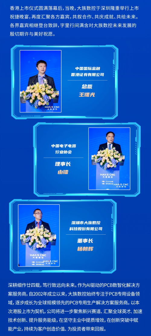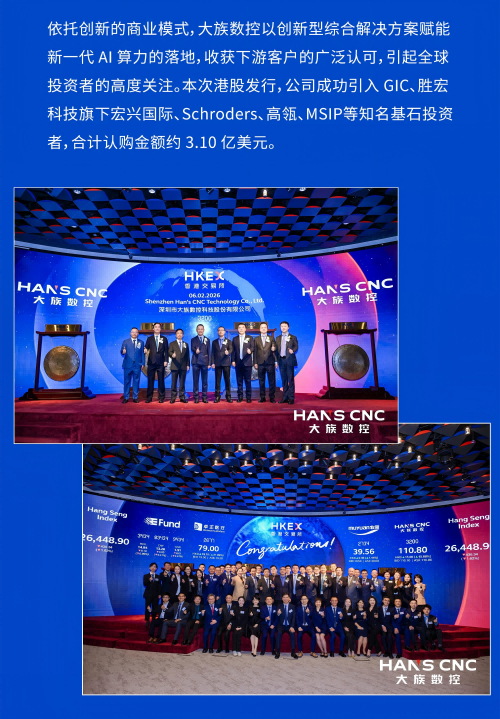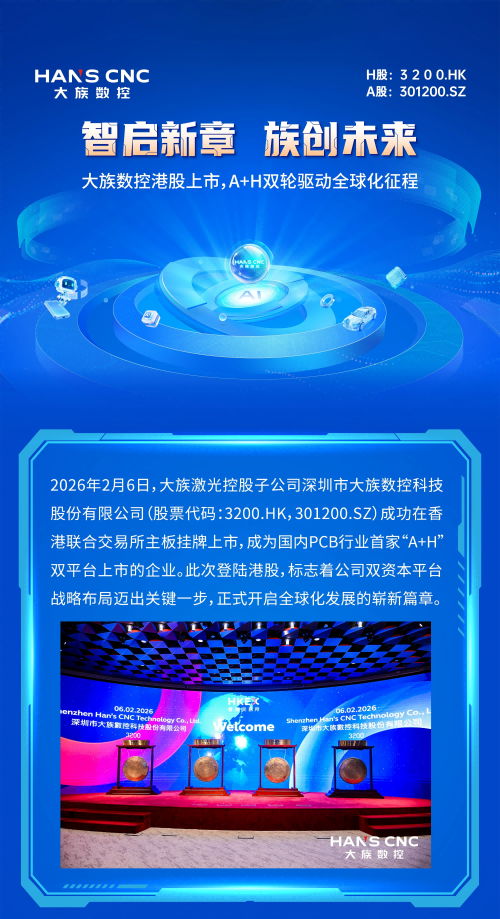 2026年2月6日,大族激光控股子公司深圳市大族數控科技股份有限公司成功在香港聯合交易所主板掛牌上市,成為國內PCB行業首家"A+H"雙平臺上市的企業。此次登陸港股,標志著公司雙資本平臺戰略布局邁出關鍵一步,正式開啟全球化發展的嶄新篇章。