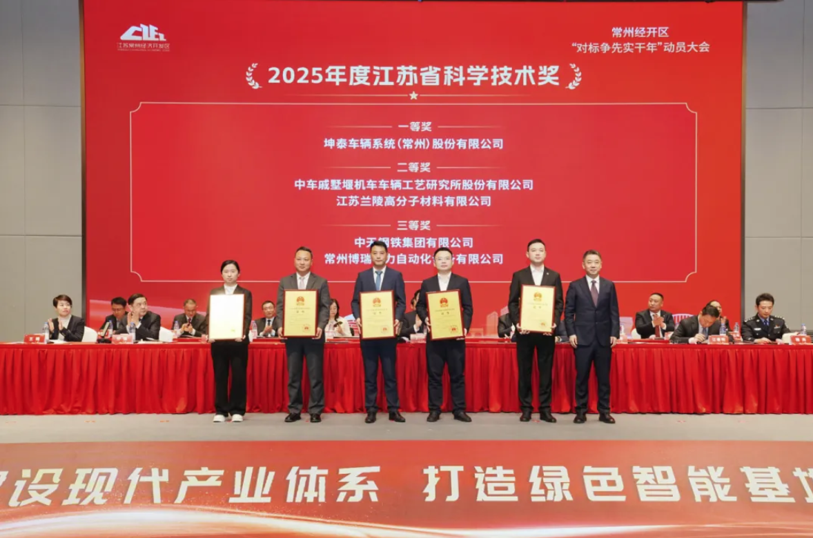 捷報頻傳,榮耀加冕!今日,常州經濟開發區 “對標爭先實干年” 動員大會隆重召開,會上對轄區內省級科技獲獎企業進行專項表彰。坤泰車輛系統(常州)股份有限公司憑借頂尖技術實力,榮獲江蘇省科學技術進步一等獎(經開區 5 家獲獎單位中僅坤泰摘得一等獎);同時憑借卓越的產品性能與產業貢獻,獲評經開區優秀貢獻企業,此外公司獲評江蘇省綠色工廠、核心產品榮獲江蘇省新技術新產品稱號,兩項榮譽均載于本次大會光榮冊,多重榮譽是對坤泰技術實力的權威認可。