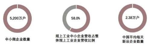 中國中小企業快速發展壯大,成為數量最大、最具活力的企業群體。2022年中小微企業數量達5,200萬家,規模以上工業中小企業營收在整體規模以上工業企業營收中的占比為58%。除此之外,中小企業還為社會發展提供了持續的新技術、新業態和新模式的參考。