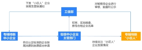 申報流程:由專精特新中小企業按屬地原則自愿提出申請,省級中小企業主管部門根據認定標準,對企業申請材料和相關佐證材料進行初審和實地抽查,初審通過的向工信部推薦,工信部組織對被推薦企業進行審核、抽查和公示。公示無異議的,由工信部認定為專精特新“小巨人”企業。