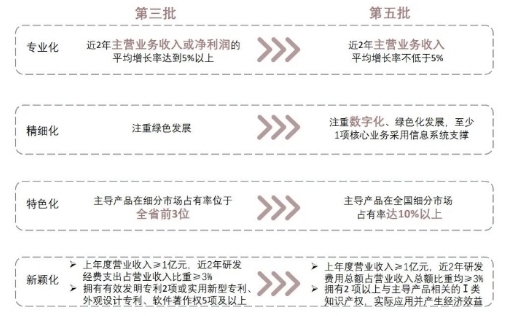 作為中小企業的領頭羊,專精特新“小巨人”企業的評審標準呈現出規范化、明確化的發展趨勢,包括專業化程度、創新能力、經濟效益、經營管理以及聚焦制造強國、網絡強國等方面,可以說是層層精選、優中選優。以第三批和第五批專精特新“小巨人"企業的評審標準為例,第五批與第三批次相比,在專業化、精細化、特色化和新穎化四個維度上均有不同程度的調整,在專業化和特色化兩個維度上相對降低了評審的標準,從而在評定工作中能夠關注到更多細分領域中的優質中小企業。除上述四個維度外,第五批的評定標準中還增加了產業鏈配套指標與主導產品所屬領域指標,更加重視產業重點領域與產業鏈關鍵環節。
