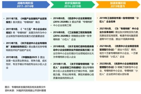 2011 年 9 月,工信部《中國產業發展和產業政策報告》首次提出將專精特新發展作為促進我國中小企業轉型升級的重要著力點,此后我國政府及相關部門出臺一系列政策,從戰略設計、基礎設施、人才支持、資金支持等方面對我國專精特新企業梯度培養體系進行了不斷完善??傮w來看,我國專精特新發展歷程可以分為戰略布局階段(2011-2016年)、初步實施階段(2016-2019年)、加速發展階段(2019年至今)。