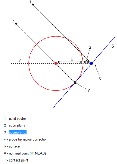 余弦誤差示意圖:接觸式接觸的是圖中的7點,測頭補償(4)后得到實測點3和4的交點,而白光直接測得就是圖示6點。所以不存在3余弦誤差(cosine error)