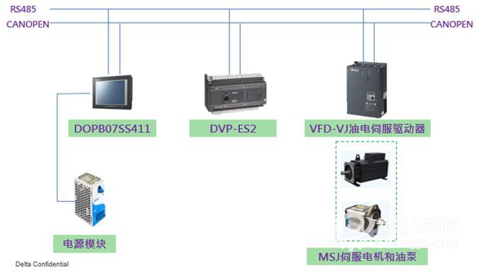 該項目中的粉末冶金液壓機適用于各種粉末的壓制成形,如鐵基、銅基、鎢、鈦、錳、硼等。臺達控制解決方案包含油電伺服驅動器VFD-VJ系列、可編程控制器(PLC)DVP-ES2系列、人機界面DOP-B系列以及電機、PG卡、壓力傳感器、控制模塊等??刂萍軜嬋鐖D1所示。