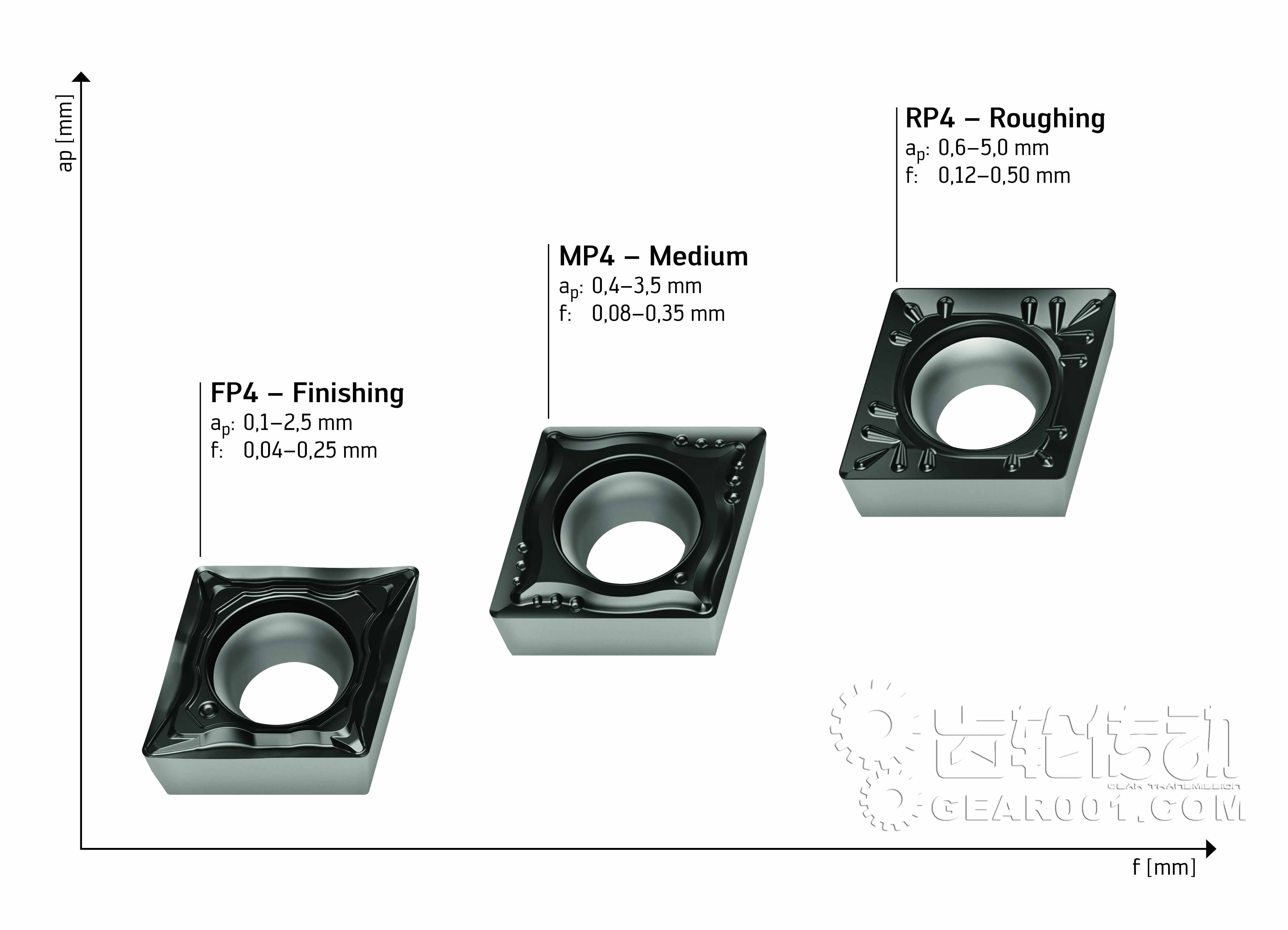 MP4:中等加工 · 高精度周邊磨削 · 高精度周邊燒結(jié) · 7° 后角 (.CGT...), · 11° 后角 (.PGT...) · ap 0.4-3.5 mm; |
