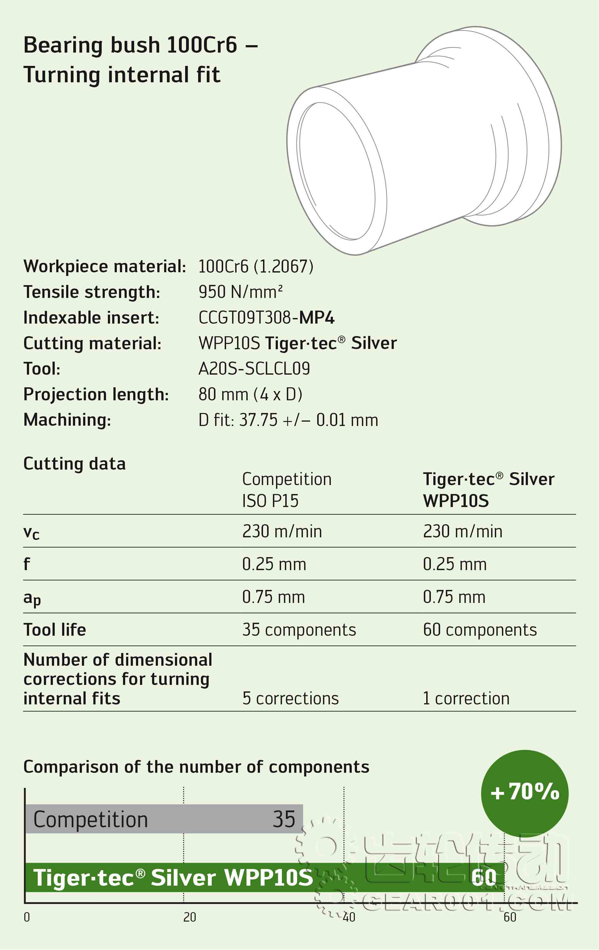 圖注:與競(jìng)爭(zhēng)對(duì)手的產(chǎn)品相比,使用 MP4 槽型和 Tiger·tec Silver (銀虎) 切削材質(zhì)加工的工件數(shù)多出 70%。