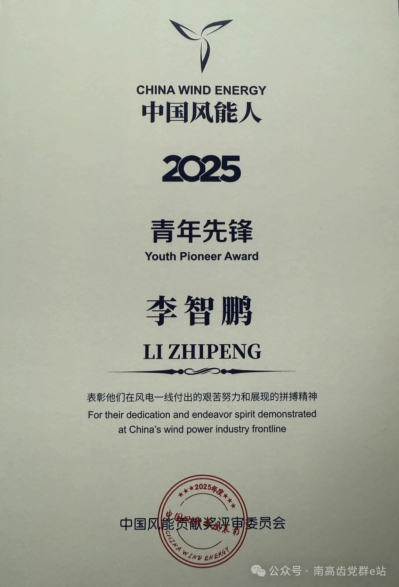近日,從2026年中國風能新春茶話會現場傳來捷報,我集團高速公司三分廠一線青年員工李智鵬,經集團團委與高速公司市場部聯合培育推報,成功獲評“2025中國風能人·青年先鋒”榮譽稱號。這是南高齒青年首次斬獲此項國家級行業青年最高榮譽,實現了歷史性的“零的突破”!