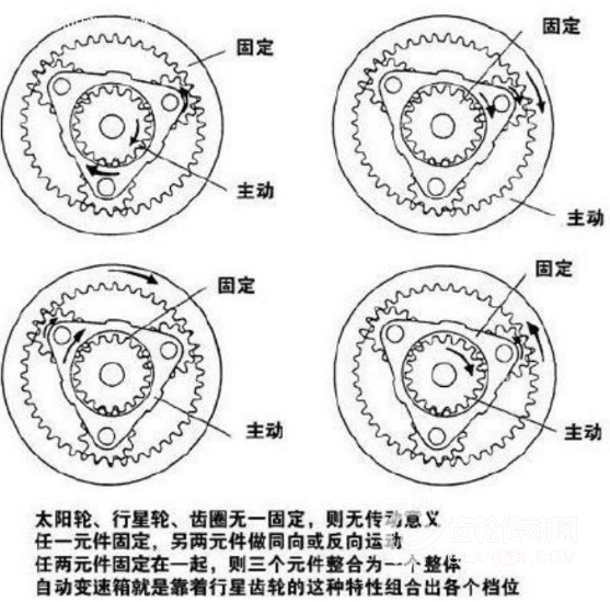 自動變速器采用行星齒輪組合的方式,利用控制某個行星齒輪的轉動就實現不同的轉速輸出。各齒輪的固定或轉動都是由行車電腦ECU發出指令并通過液壓來實現。