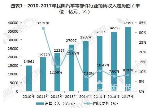 近年來,中國汽車零部件行業市場規模的發展速度趨于穩定。根據中國汽車工業協會統計數據顯示,2017年,我國汽車零部件制造企業實現銷售收入37392億元,同比增長8.20%。