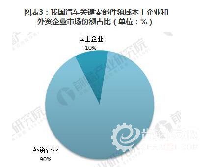 盡管外資背景企業(獨資以及中外合資)僅占規模企業數的20%,但其市場份額高達70%以上。而在汽車電子和發動機關鍵零部件等高科技含量領域,外資市場份額高達90%。在發動機管理系統(包括電噴)、ABS等核心零部件領域,外資企業所占比例分別高達95%和90%以上。