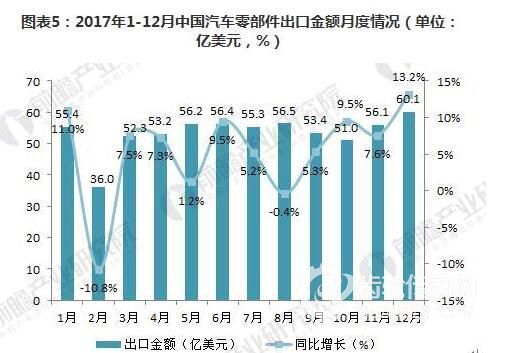 從月度汽車零部件出口金額同比變化情況來看,2月、8月出口金額同比有所下降,其他各月均呈增長,但除1月和12月外,各月增速均低于10%。