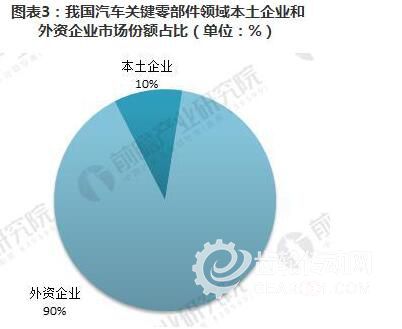 盡管外資背景企業(獨資以及中外合資)僅占規模企業數的20%,但其市場份額高達70%以上。而在汽車電子和發動機關鍵零部件等高科技含量領域,外資市場份額高達90%。在發動機管理系統(包括電噴)、ABS等核心零部件領域,外資企業所占比例分別高達95%和90%以上。