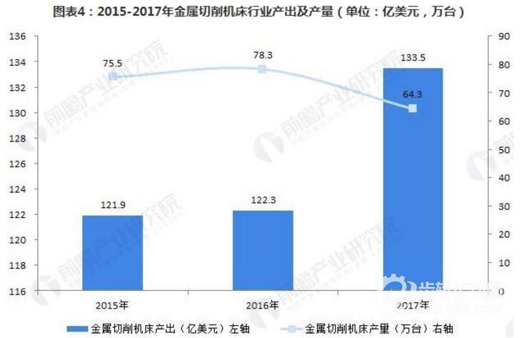 根據中國機床工具工業協會統計數據,2016年、2017年,我國金屬切削機床產出約為122億美元、133.5億美元,2017年產值較上年同期增長9.43%;同期對應產量分別為78.32萬臺、64.30萬臺,2017年產量較上年同期下降17.88%。