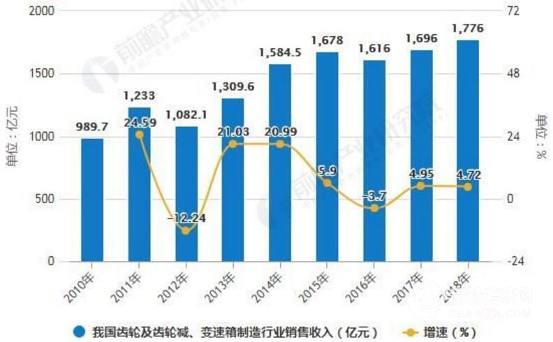 齒輪行業的發展與我國工業建設息息相關,尤其是汽車行業和機械設備制造業隨著我國經濟發展取得巨大發展成就,拉動了我國齒輪行業下游需求的擴大,帶來了齒輪行業規模的整體擴大。據前瞻產業研究院發布的《中國齒輪行業產銷需求預測與轉型升級研究報告》統計數據顯示,2010-2017年,我國齒輪及齒輪減、變速箱制造行業整體發展較為迅速,行業內規模以上企業銷售收入整體提高明顯。2010年我國齒輪行業銷售收入已達989.7億元,2011年我國齒輪行業銷售收入突破千億元。到了2015年我國齒輪行業銷售收入增長至1678億元。截止到2017年我國齒輪行業銷售收入達到了1696.0億元,年均增長率超過10%。其中2012年和2016年受到國家整體經濟環境和政策因素的影響,銷售收入有所下滑,但行業整體銷售規模明顯提高。2018年,我國汽車產量低于預期,對齒輪行業發展帶來負面影響,預計2018年行業規模增長速度將略有下降,行業銷量收入將達到1776億元。