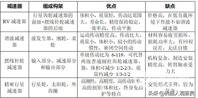 減速器是連接動力源和執行機構的中間機構,具有匹配轉速和傳遞轉矩的作用。它把電動機、內燃機或其他高速運轉的動力通過減速器的輸入軸上的齒數少的齒輪嚙合輸出軸上的大齒輪來達到降低轉速,增加轉矩的目的。減速器種類及型號繁多,按照控制精度劃分,減速器可分為一般傳動減速器和精密減速器。一般傳動減速器控制精度低,可滿足機械設備基本的動力傳動需求。精密減速器回程間隙小、精度較高、使用壽命長,更加可靠穩定,應用于機器人、數控機床等高端領域。精密減速器種類較多,包括 RV 減速器、諧波齒輪減速器、擺線針輪行星減速器、精密行星減速器、濾波齒輪減速器等,目前工業機器人領域適用較多的精密減速器是 RV 減速器和諧波減速器。