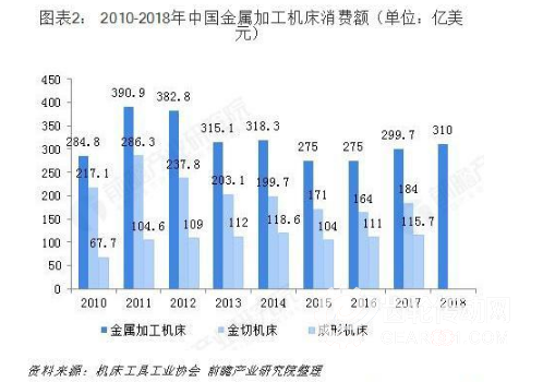 2001-2011年10年間,中國金屬加工機床消費額快速增長,從2001年的29.7億美元增長到2011年的390.9億美元,增長12倍多。隨后幾年呈波動下行趨勢,2017年實現了較明顯的增長,達到299.7億美元,約為最高峰時的77%。這期間,成形機床消費額的波動幅度相對較小。2018年延續了2017年的增長趨勢,根據目前掌握的情況,預測2018年中國金屬加工機床消費額可能達到310億美元左右。