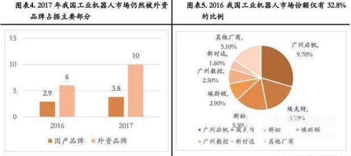 2017年,中國工業(yè)機(jī)器人13.8萬的銷量中,外資品牌占據(jù)了絕大部分的市場份額,國內(nèi)自主品牌機(jī)器人在銷量上有所增加,但所占份額仍然較少。