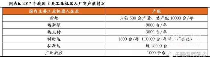 2017年,我國主要的工業(yè)機(jī)器人生產(chǎn)廠商為新松、埃斯頓、埃夫特、新時(shí)達(dá)、拓斯達(dá)、廣州數(shù)控等企業(yè);其中新松、埃斯頓、拓斯達(dá)工業(yè)機(jī)器人年產(chǎn)量均超過9000臺(tái),新時(shí)達(dá)有一個(gè)年產(chǎn)能為10000臺(tái)的新工廠在建。