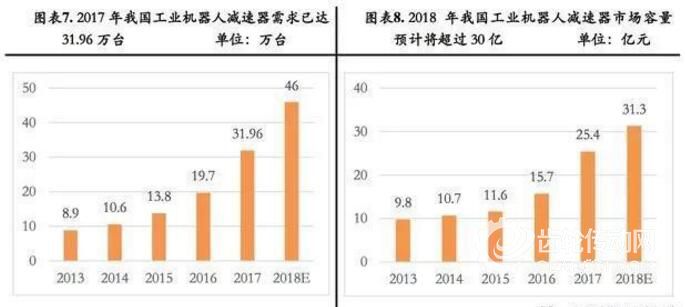 據(jù)高工產(chǎn)研機(jī)器人研究所數(shù)據(jù)顯示,2017年中國工業(yè)機(jī)器人減速器新增需求量達(dá)31.96萬臺(tái),同比增速超62.23%;預(yù)計(jì)2018年中國工業(yè)機(jī)器人減速器需求將超過40萬臺(tái),市場容量將超過30億元。