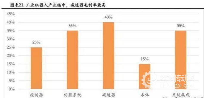 上游核心零部件在工業(yè)機(jī)器人產(chǎn)業(yè)鏈中毛利率較高。其中減速器部分毛利率最高,未來降價(jià)空間最大,伯朗特等國產(chǎn)工業(yè)機(jī)器人價(jià)格存在進(jìn)一步下降的可能性。