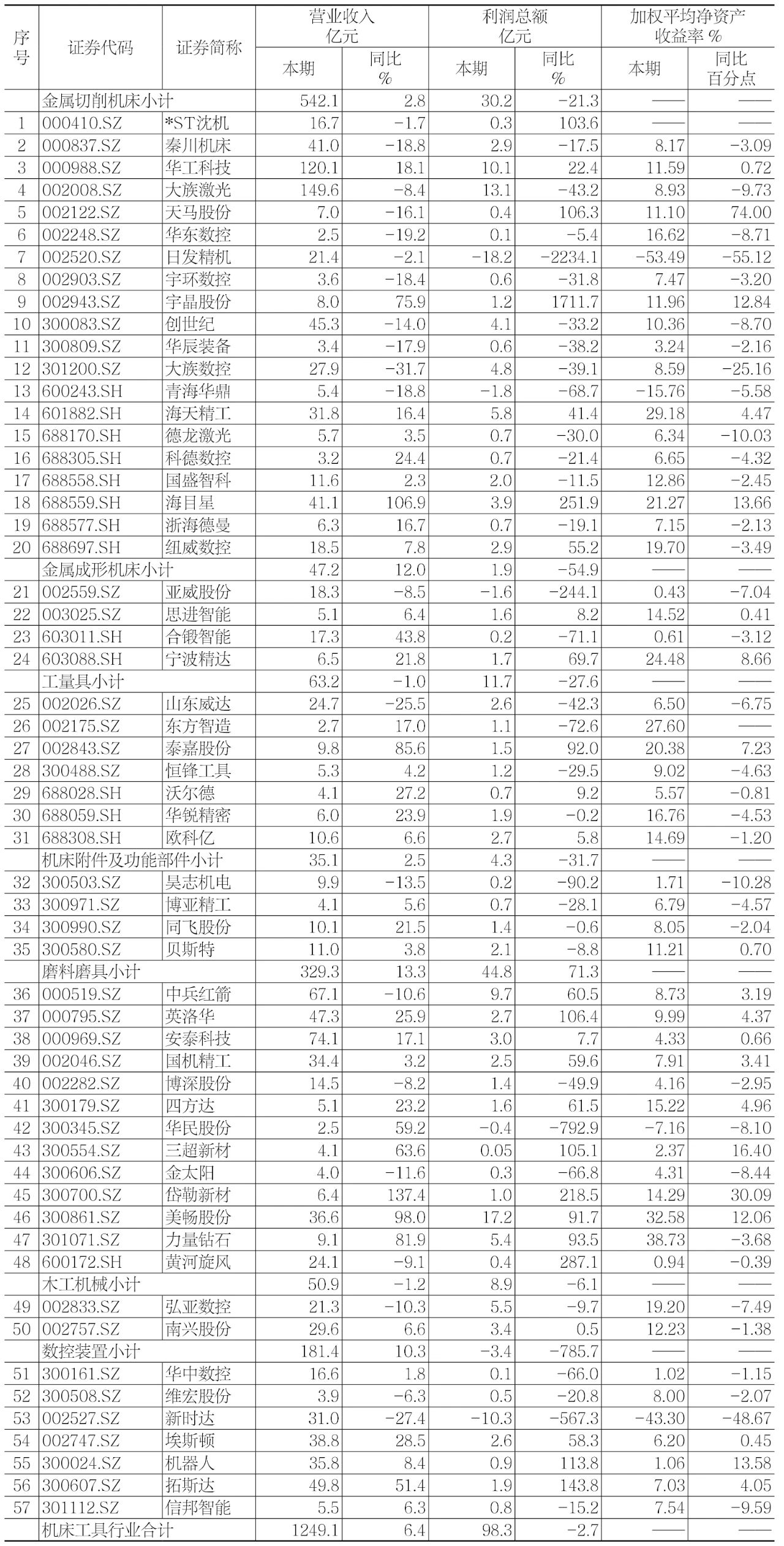 57家重點監測的上市公司中,金屬切削機床行業20家,占35.1%,居于首位;磨料磨具行業13家,占22.8%,位居第二;工量具和數控裝置行業均為7家,各占12.3%;金屬成形機床和機床附件及功能部件行業均為4家,各占7.0%;木工機械行業2家,占3.5%。具體行業分布情況如圖2所示。