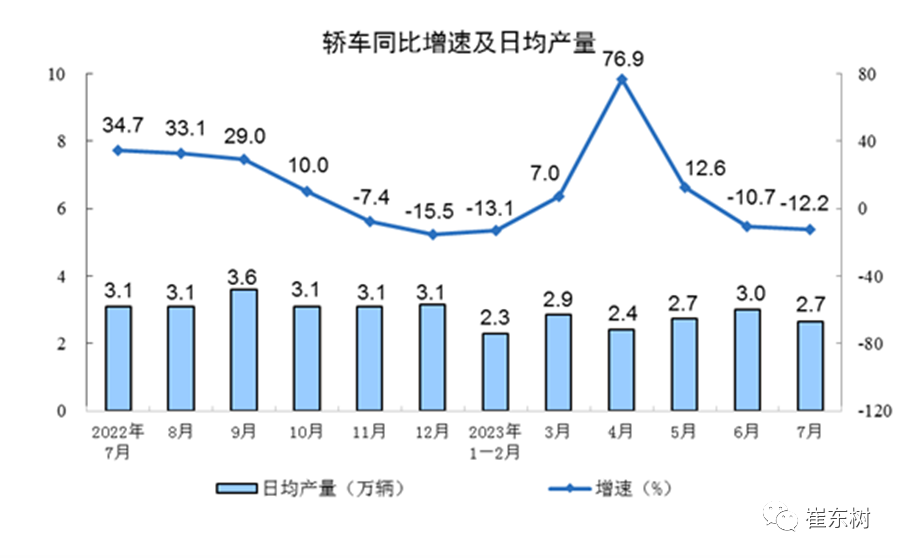 1—7月份,規模以上工業增加值同比增長3.8%,其中汽車增加值增12%。7月份,41個大類行業中有23個行業增加值保持同比增長,其中汽車制造業增長6.2%。