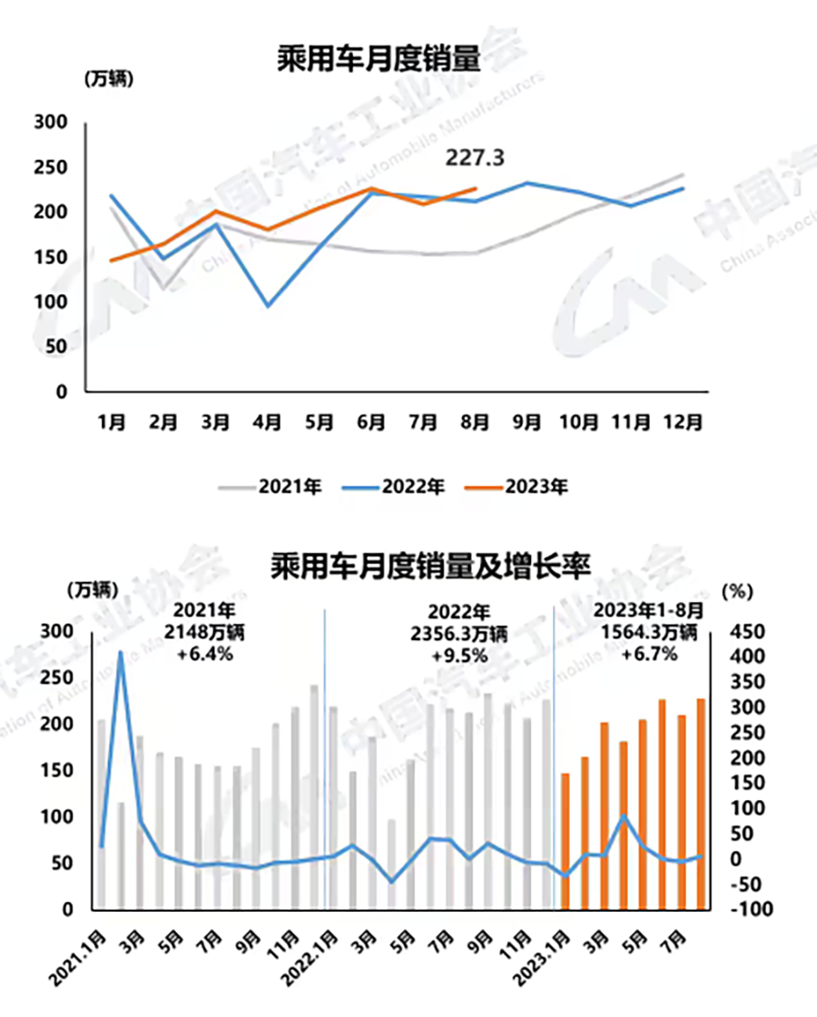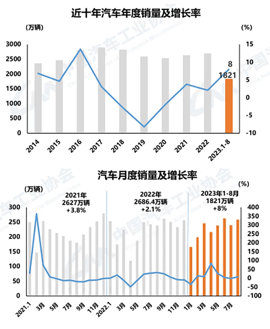 8月,汽車產銷分別達到257.5萬輛和258.2萬輛,環比分別增長7.2%和8.2%,同比分別增長7.5%和8.4%。1-8月,汽車產銷累計完成1822.5萬輛和1821萬輛,同比分別增長7.4%和8%。