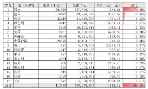 涂層刀片進(jìn)口來源地(占比見表1)主要為:日本22.91%、德國19.10%、瑞典13.70%、以色列12.99%、美國8.50%、韓國6.04%、印度5.84%。非涂層刀片進(jìn)口來源地(占比見表2)主要為:日本74.49%、德國9.85%、韓國6.33%、以色列1.67%、泰國1.43%、美國1.20%、盧森堡0.98%。