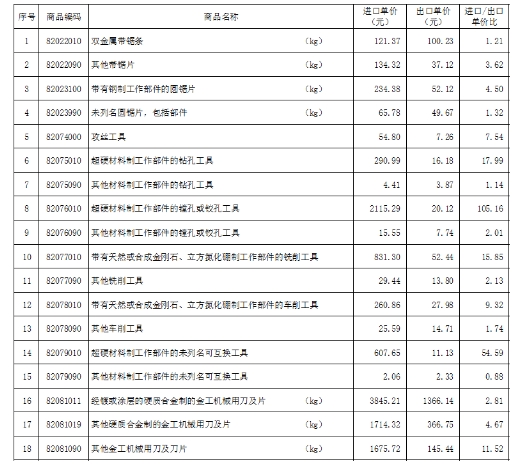 附加說明:海關(guān)數(shù)據(jù)是根據(jù)海關(guān)進(jìn)出口商品編碼進(jìn)行分類,與行業(yè)習(xí)慣分類不完全一致。表中所列的產(chǎn)品可能未完全包括所有的工具產(chǎn)品,也可能包括了不屬于工具行業(yè)的產(chǎn)品。附表中,在計算產(chǎn)品單價時,圓鋸片,刀片,帶鋸條的單位采用公斤(kg),其它類產(chǎn)品以件為單位。