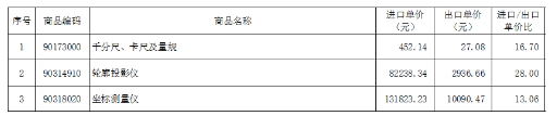 比較相同商品編碼產(chǎn)品,進(jìn)口量具和量儀價格遠(yuǎn)高于出口價格(表4)。